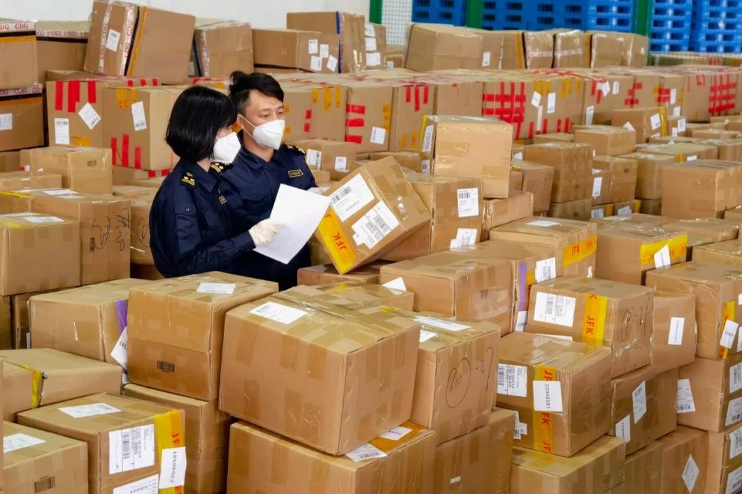 Xiamen Customs officials inspect e-commerce commodities to be exported. (Photo from China Customs Media Center)