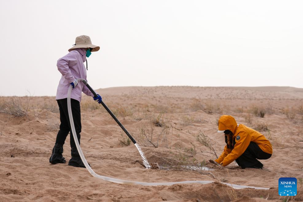 Volunteers water tree seedlings at the Zhonglin ecological public welfare forest base of Minqin County, northwest China's Gansu Province, April 20, 2026.