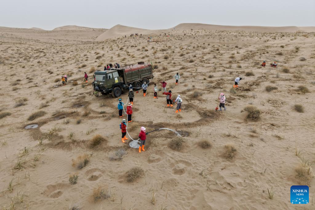 Volunteers from Hunan and Jiangxi provinces dig a pit for water storage at the Zhonglin ecological public welfare forest base of Minqin County, northwest China's Gansu Province, April 20, 2026.