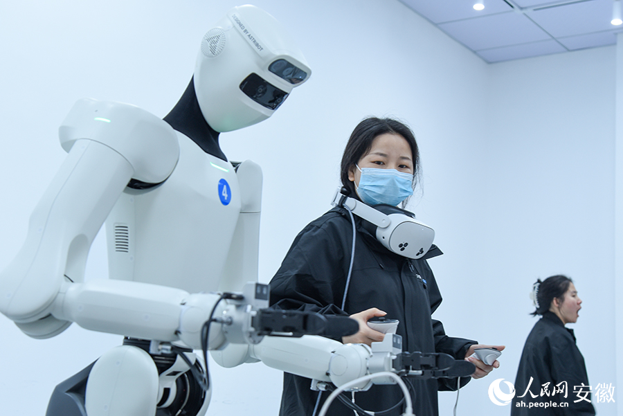 An embodied intelligent robot repeatedly practices movements under a robot trainer's guidance at a standardized robot training facility in Yushan district, Ma'anshan, east China's Anhui Province. (People's Daily Online/Li Ximeng)