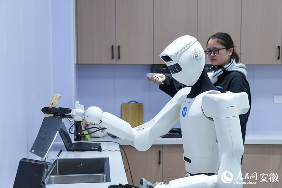 An embodied intelligent robot performs household chores under a robot trainer's guidance at a standardized robot training facility in Yushan district, Ma'anshan, east China's Anhui Province. (People's Daily Online/Li Ximeng)