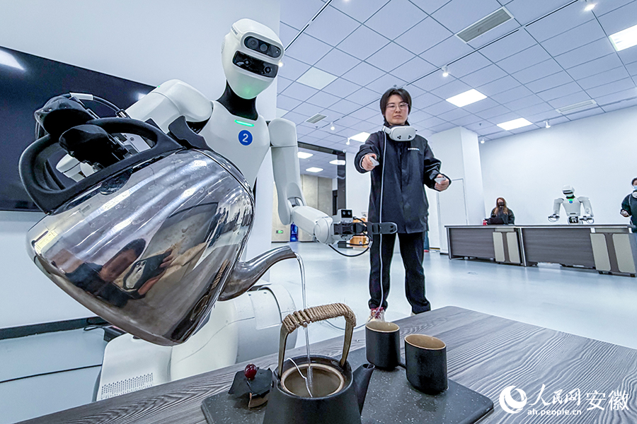 An embodied intelligent robot pours water from a teapot under a robot trainer's guidance at a standardized robot training facility in Yushan district, Ma'anshan, east China's Anhui Province. (People's Daily Online/Li Ximeng)