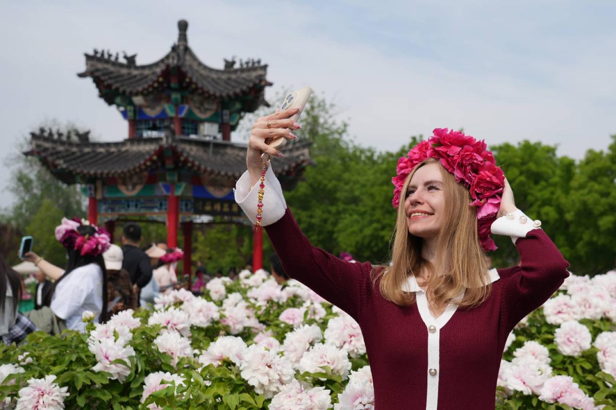 A foreign tourist poses for a selfie in a garden in Heze, east China's Shandong province. (Photo/Li Baozhu)