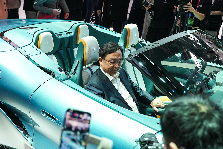 Photo taken on April 25, 2026, shows Wang Chuanfu, CEO of BYD, sitting in the cabin of a BYD concept vehicle displayed at the 2026 Beijing International Automotive Exhibition (Auto China 2026), which is being held from April 24 to May 3 in Beijing. (People's Daily Online/Peng Yukai)