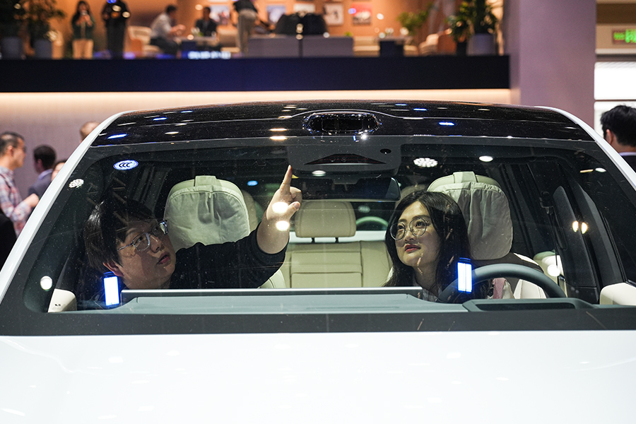 Photo taken on April 24, 2026, shows two visitors experiencing a new energy vehicle at the 2026 Beijing International Automotive Exhibition (Auto China 2026), which is being held from April 24 to May 3 in Beijing. (People's Daily Online/Peng Yukai)