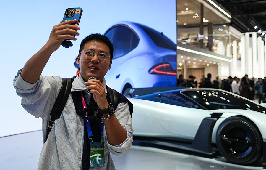 Photo taken on April 25, 2026, shows a vlogger filming a new energy vehicle at the 2026 Beijing International Automotive Exhibition (Auto China 2026), which is being held from April 24 to May 3 in Beijing. (People's Daily Online/Peng Yukai)