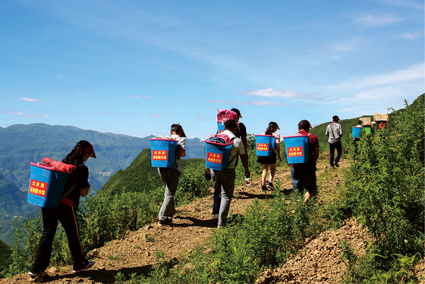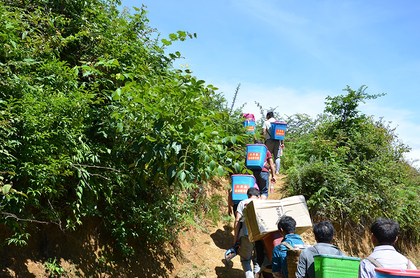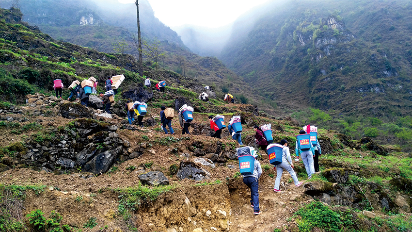 Volunteers carry books and supplies in backpacks to reach villages that are difficult to access by vehicle in Daguan county, Zhaotong city, southwest China's Yunnan Province. (Photo courtesy of the Culture and Tourism Bureau of Daguan County)