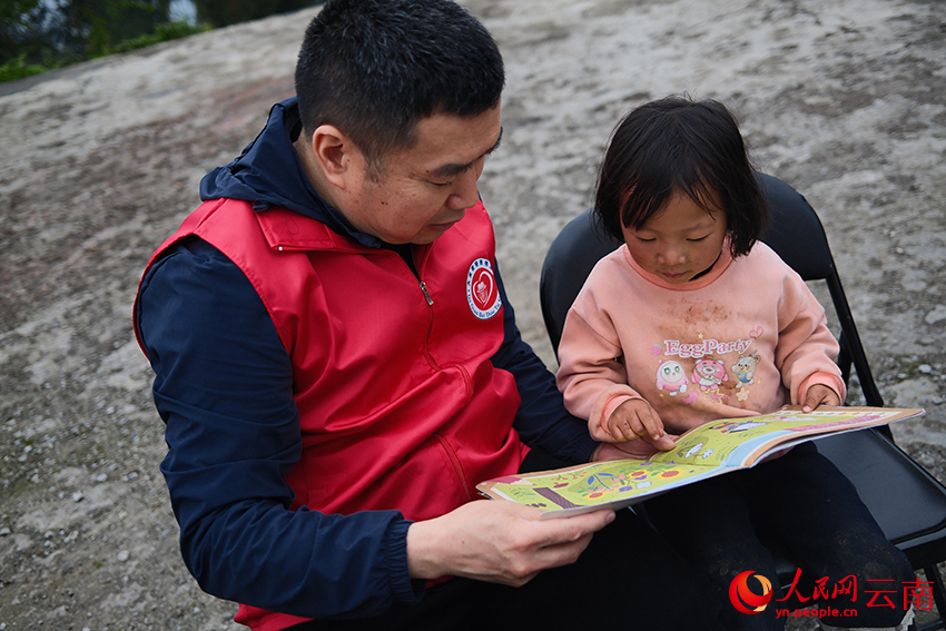 A volunteer reads a book for a child in a Miao village in Daguan county, Zhaotong city, southwest China's Yunnan Province. (People's Daily Online/Zhuang Zhibin)