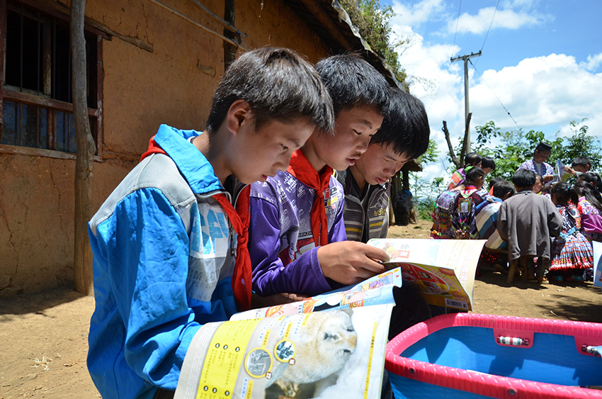Children read books brought by volunteers in a village in Daguan county, Zhaotong city, southwest China's Yunnan Province. (Photo courtesy of the Culture and Tourism Bureau of Daguan County)