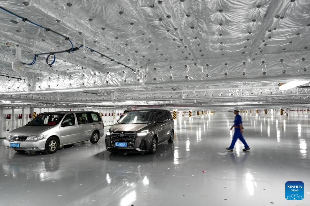A staff member walks past the 14th story of the carpark on car carrier Glovis Leader in Guangzhou, south China's Guangdong Province, April 28, 2026. A car carrier with a maximum capacity of 10,800 car equivalent units, described as the world's largest of its kind, was delivered Tuesday in the southern Chinese city of Guangzhou. The vessel, named Glovis Leader, was built by Guangzhou Shipyard International Company Limited under the China State Shipbuilding Corporation (CSSC), together with China Shipbuilding Trading Co., Ltd. It was delivered to HMM, a leading shipping company in the Republic of Korea (ROK). After delivery, the vessel will be operated by Hyundai Glovis Co., Ltd., a logistics company also based in the ROK. (Xinhua/Wu Lu)