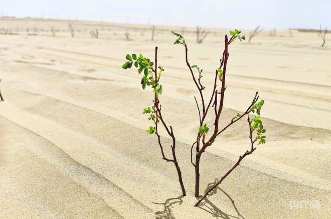 Today, the rose branches in the demonstration area have grown to 30-40 centimeters, their buds plump and ready to bloom, and a subtle fragrance drifts across the desert.