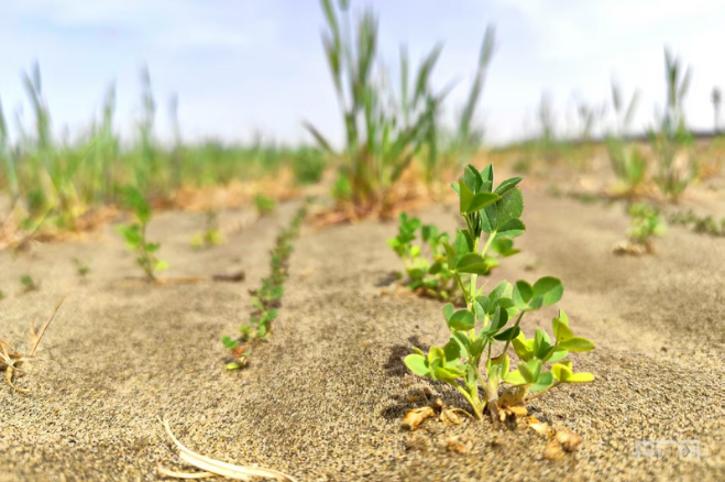 Photo shows newly sprouted alfalfa seedlings in a desertification control area in Hetian county, Hetian prefecture, northwest China's Xinjiang Uygur Autonomous Region. (Photo/Ma Xiaoshan)
