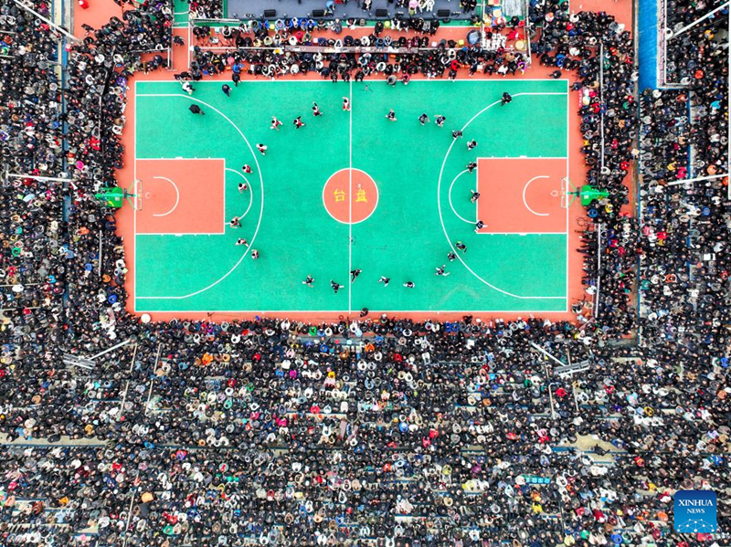 Photo shows the aerial view of the final match between Team Qiandongnan and Team Zunyi at "Village BA" basketball tournament in Taipan Village, Taijiang County, southwest China's Guizhou Province, March 27, 2023. (Xinhua/Ou Dongqu)