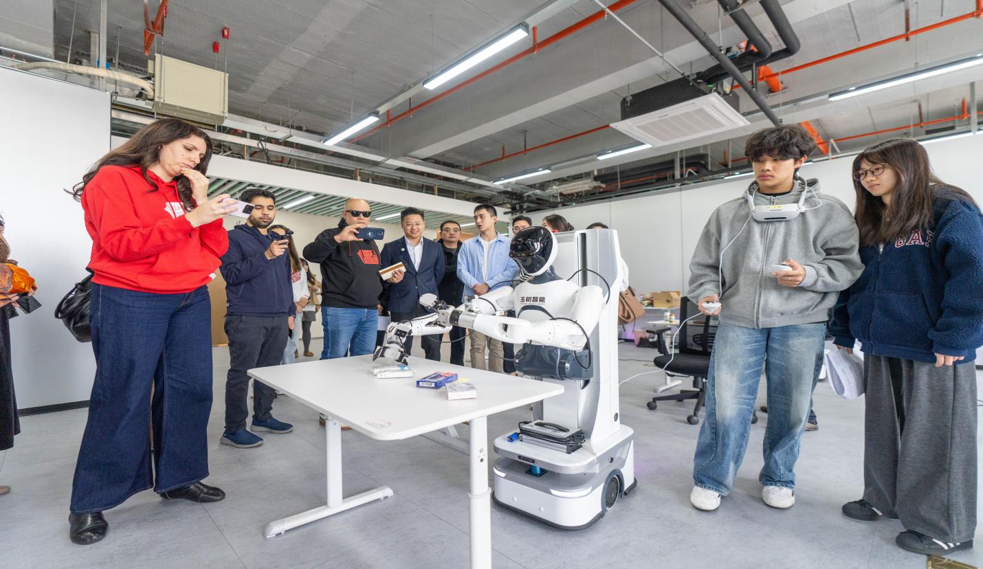 Wang Zi, founder and chairman of the World Robotics Alliance (WRA), engages with the media team during the tour at the Shenzhen Embodied Robotics Intelligent Innovation Center in Qianhai, Shenzhen, south China's Guangdong Province, Nov. 27, 2025. (People's Daily Online/Xu Zheng)