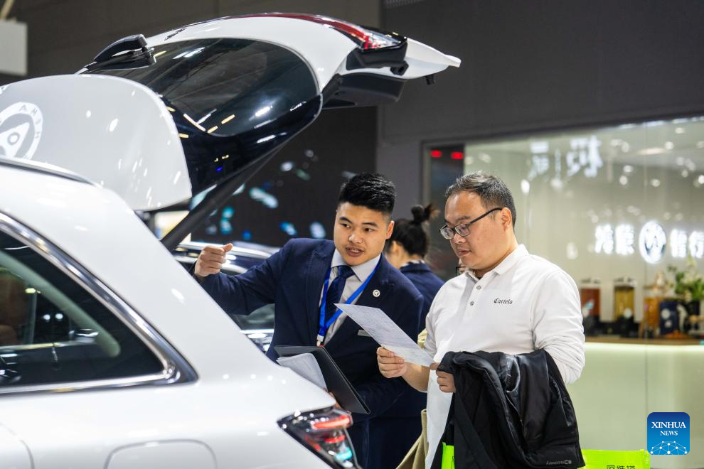 A visitor (L) learns about a car on display at the 21st Changsha International Automobile Expo in Changsha, central China's Hunan Province, on Dec. 10, 2025. The 6-day expo kicked off on Wednesday at the Changsha International Convention and Exhibition Center, showcasing some 1,000 vehicles from over 70 automobile brands. (Xinhua/Chen Sihan)