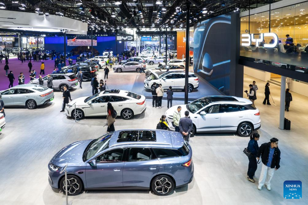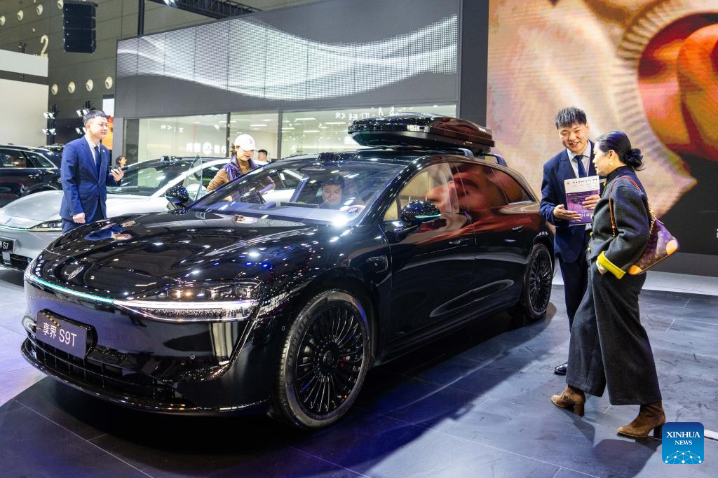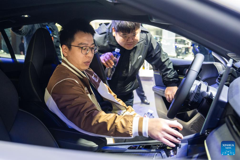 A staff member (C) introduces a car on display to visitors at the 21st Changsha International Automobile Expo in Changsha, central China's Hunan Province, on Dec. 10, 2025. The 6-day expo kicked off on Wednesday at the Changsha International Convention and Exhibition Center, showcasing some 1,000 vehicles from over 70 automobile brands. (Xinhua/Chen Sihan)