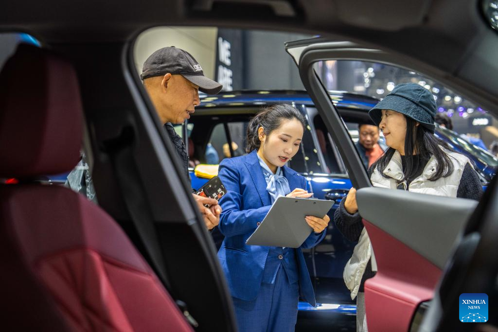 A staff member (L) introduces a car on display to a visitor at the 21st Changsha International Automobile Expo in Changsha, central China's Hunan Province, on Dec. 10, 2025. The 6-day expo kicked off on Wednesday at the Changsha International Convention and Exhibition Center, showcasing some 1,000 vehicles from over 70 automobile brands. (Xinhua/Chen Sihan)