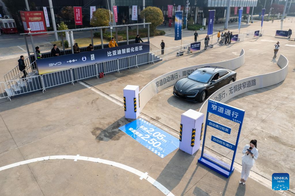 A car demonstrates the intelligent driving assistance technology at the 21st Changsha International Automobile Expo in Changsha, central China's Hunan Province, on Dec. 10, 2025. The 6-day expo kicked off on Wednesday at the Changsha International Convention and Exhibition Center, showcasing some 1,000 vehicles from over 70 automobile brands. (Xinhua/Chen Sihan)