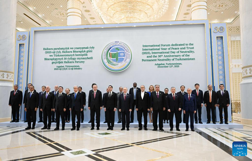 Chinese President Xi Jinping's special envoy Peng Qinghua, also vice chairman of the Standing Committee of China's National People's Congress, and other participants of the High-Level International Forum dedicated to the International Year of Peace and Trust pose for a group photo in Ashgabat, Turkmenistan. At the invitation of Turkmenistan, Peng visited the Turkmen capital of Ashgabat from Dec. 12 to 13 to attend the forum, handed over to the Turkmen side President Xi's congratulatory letter to the forum, met with Dunyagozel Gulmanova, chairperson of the National Assembly (Mejlis) of Turkmenistan, and leaders of major political parties, and participated in people-to-people dialogues between China and Turkmenistan. (Xinhua/Li Renzi)