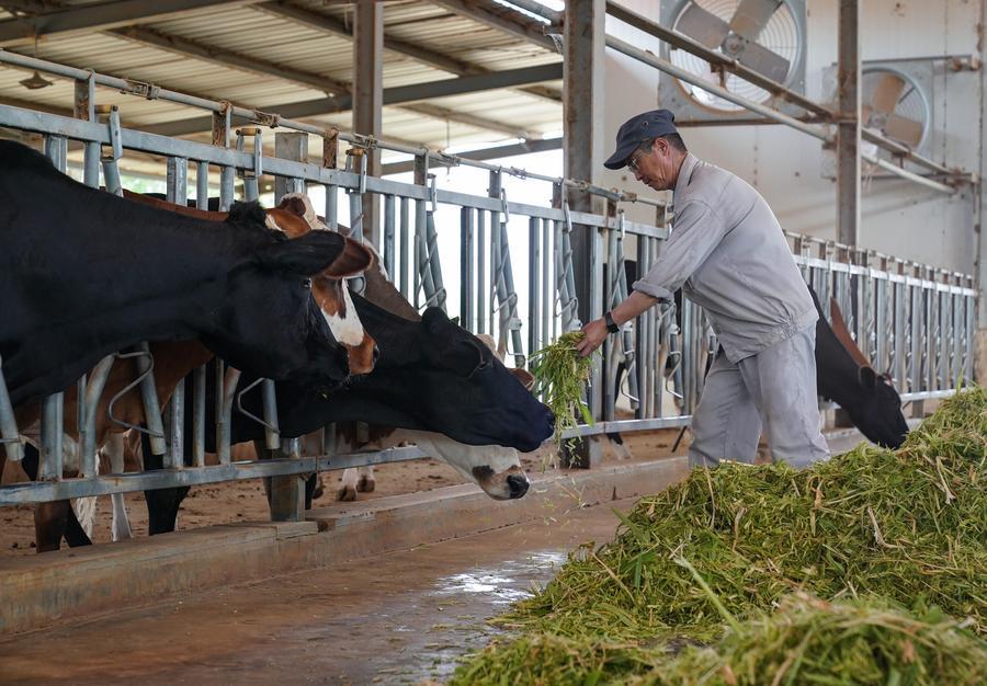 A herder feeds cattle with alfalfa fodder at a pasture, which was built and upgraded under the guidance of experts from the Livestock Technology Demonstration Center in Tiguent, Mauritania, July 15, 2025. (Xinhua/Han Xu)