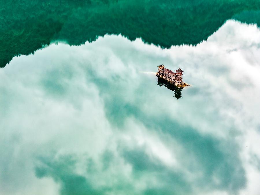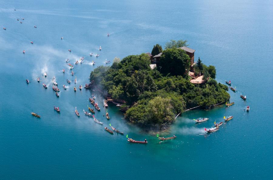 An aerial drone photo taken on Sept. 16, 2025 shows local people sailing around an island while circling the lake by boat in Yanyuan County of Liangshan Yi Autonomous Prefecture, southwest China's Sichuan Province. (Xinhua/Jiang Hongjing)