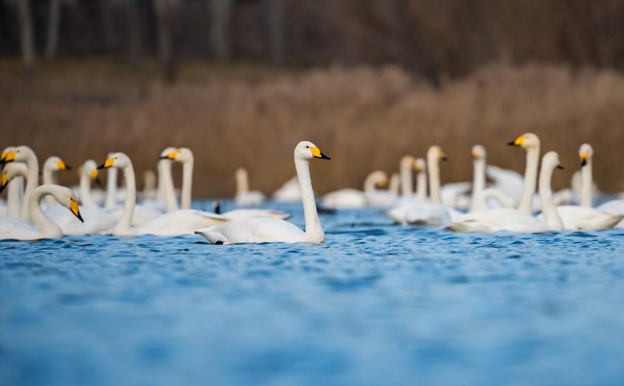 This photo taken on Dec. 20, 2025 shows swans at a wetland in Sanmenxia, central China's Henan Province. (Photo by Zhao Yongtao/Xinhua)