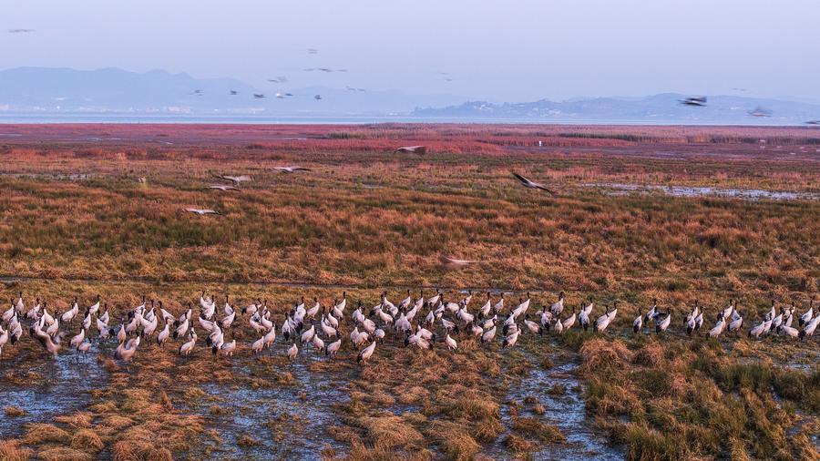 A drone photo shows black-necked cranes at Caohai National Nature Reserve in Yi-Hui-Miao Autonomous County of Weining, southwest China's Guizhou Province, Dec. 1, 2025. (Xinhua/Yang Wenbin)