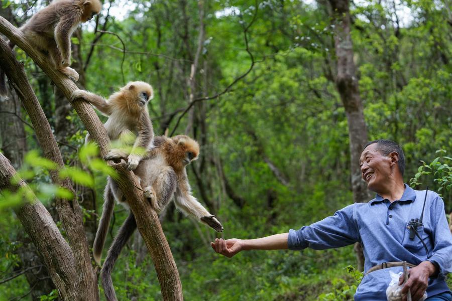 A ranger interacts with Sichuan golden snub-nosed monkeys in the Pingwu Sichuan golden snub-nosed monkey popular science education base in Pingwu County, Mianyang City of southwest China's Sichuan Province, May 21, 2025. (Xinhua/Jiang Hongjing)