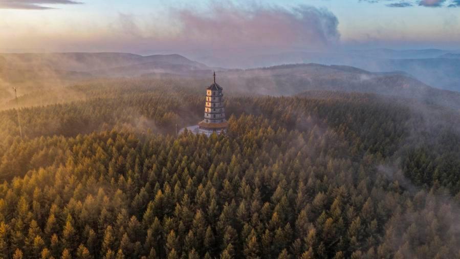 An aerial drone photo taken on Sept. 24, 2025 shows the autumn scenery in the Saihanba National Forest Park in Chengde City, north China's Hebei Province. (Photo by Liu Mancang/Xinhua)