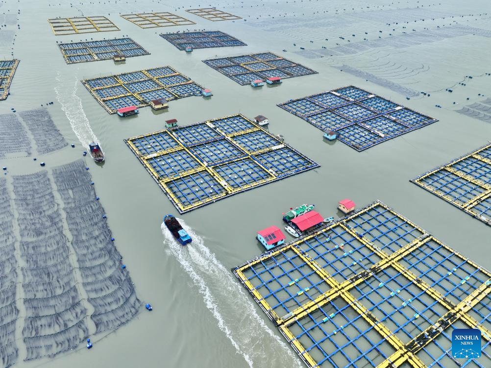 An aerial drone photo shows boats sailing at a mariculture area in Xiahu Town of Xiapu County, Ningde, southeast China's Fujian Province, Jan. 23, 2026. In recent years, Ningde has promoted the high-quality development of the mariculture industry by strengthening marine management and improving the technological application, thus injecting new impetus into rural revitalization. (Xinhua/Jiang Kehong)