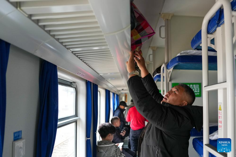 A passenger arranges his luggage in a carriage of train K303 at Guangzhou Railway Station in Guangzhou, south China's Guangdong Province, Jan. 25, 2026. Train K303, the last conventional train departed here on Sunday, concluding the terminal operation of this kind of trains at the century-old station. (Xinhua/Wu Lu)