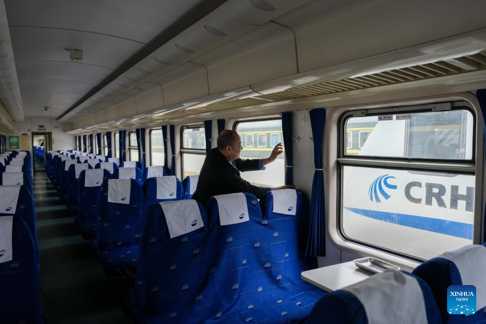 An attendant of train K303 prepares for train K303's departure at Guangzhou Railway Station in Guangzhou, south China's Guangdong Province, Jan. 25, 2026. Train K303, the last conventional train departed here on Sunday, concluding the terminal operation of this kind of trains at the century-old station. (Xinhua/Wu Lu)
