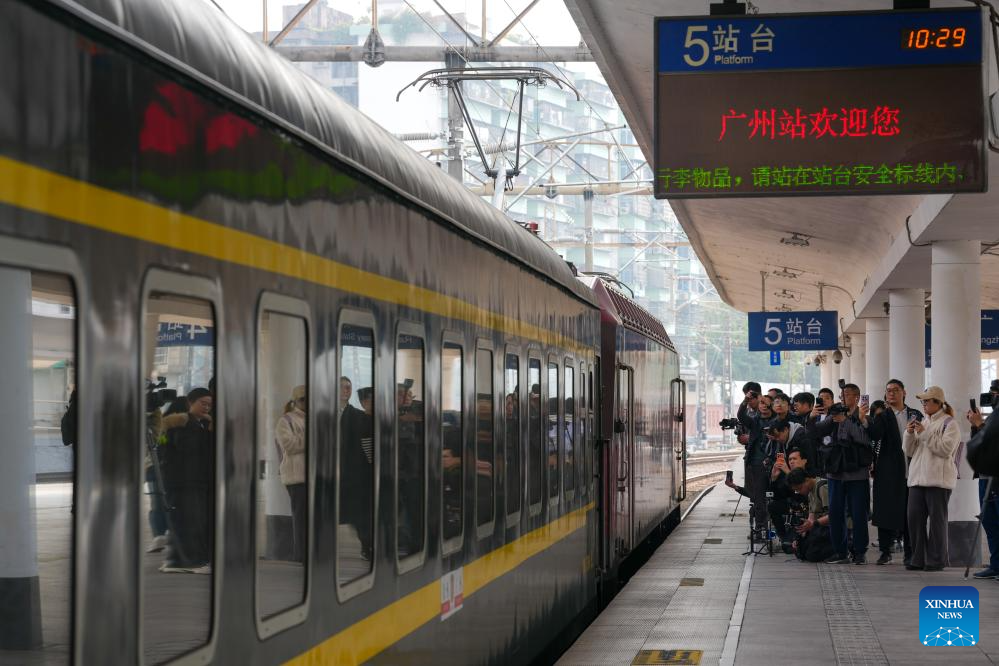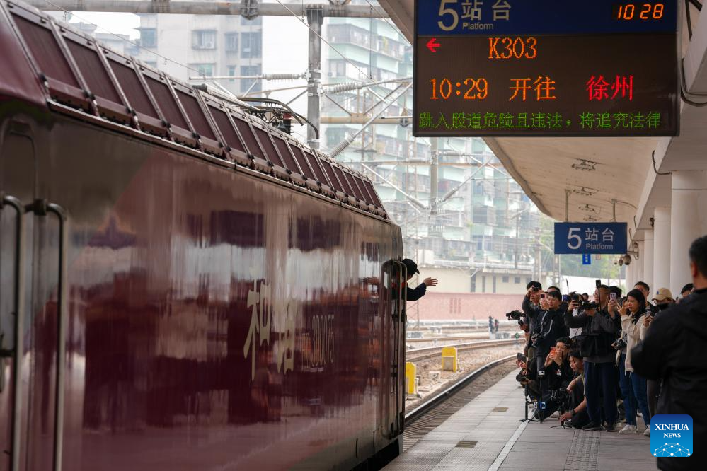 Train K303 prepares to depart from Guangzhou Railway Station in Guangzhou, south China's Guangdong Province, Jan. 25, 2026. Train K303, the last conventional train departed here on Sunday, concluding the terminal operation of this kind of trains at the century-old station. (Xinhua/Wu Lu)