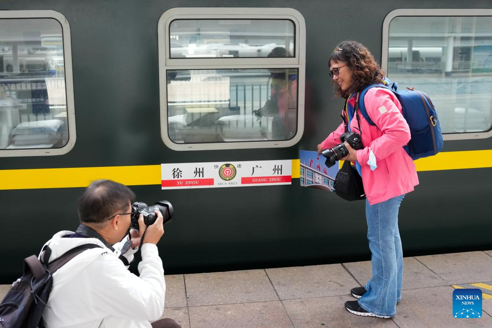 A passenger poses for photos beside train K303 at Guangzhou Railway Station in Guangzhou, south China's Guangdong Province, Jan. 25, 2026. Train K303, the last conventional train departed here on Sunday, concluding the terminal operation of this kind of trains at the century-old station. (Xinhua/Wu Lu)