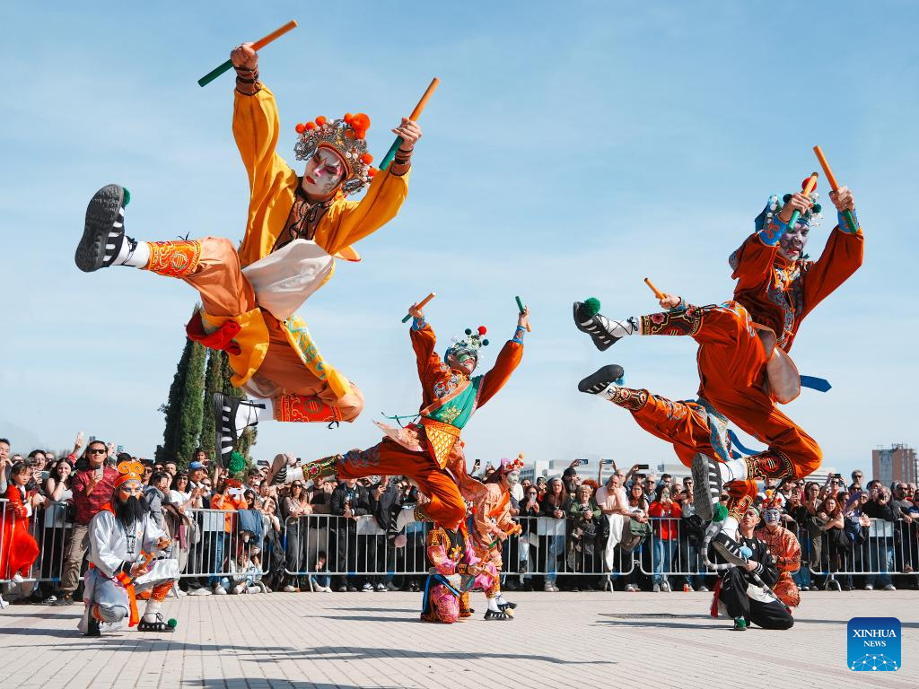 Yingge performers take part in a parade celebrating Chinese New Year in Madrid, Spain, Feb. 22, 2026. (Photo by Zhang Yuheng/Xinhua)