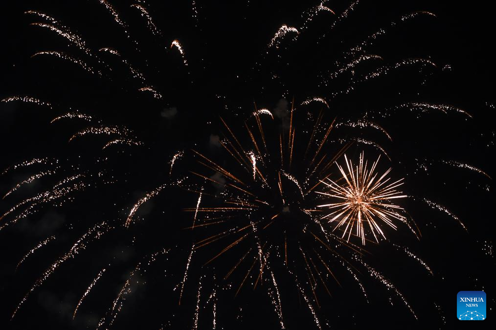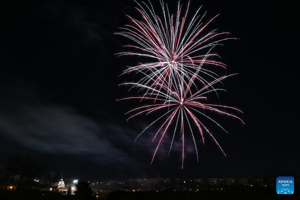 This photo taken on Feb. 21, 2026 shows fireworks celebrating the Chinese New Year in Madrid, Spain. Fireworks lit up the sky over Pradolongo Park on Saturday as the city marked the Chinese New Year. (Photo by Gustavo Valiente/Xinhua)
