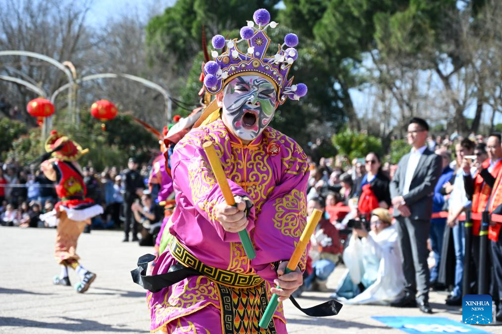 A Yingge performer takes part in a parade celebrating Chinese New Year in Madrid, Spain, Feb. 22, 2026. (Photo by Gustavo Valiente/Xinhua)