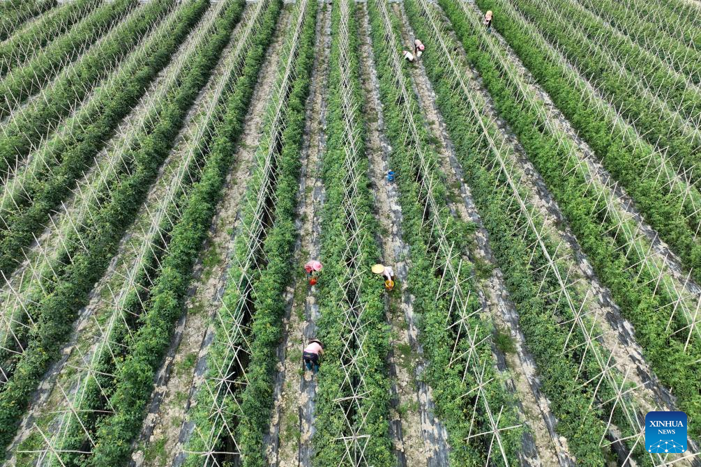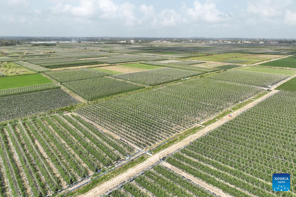 An aerial drone photo taken on Feb. 25, 2026 shows a cherry tomato planting base in Tanli Village of Ding'an County, south China's Hainan Province. Cherry tomatoes here now entered harvest season. Relying on its natural advantages, the county has developed and expanded the cherry tomato industry by perfecting industrial chain, enriching varieties and integrating with tourism. (Xinhua/Zhang Liyun)