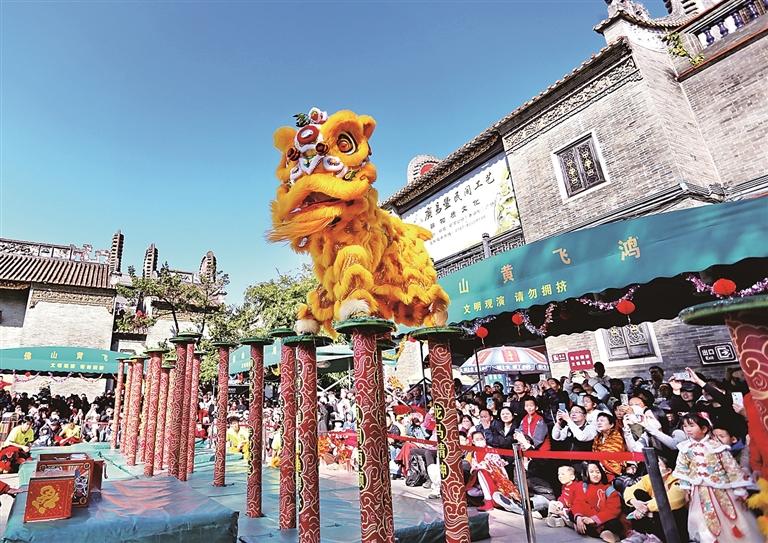 Tourists watch a lion dance performance at a scenic area in Foshan city, south China's Guangdong Province. (Photo/Xinhua)
