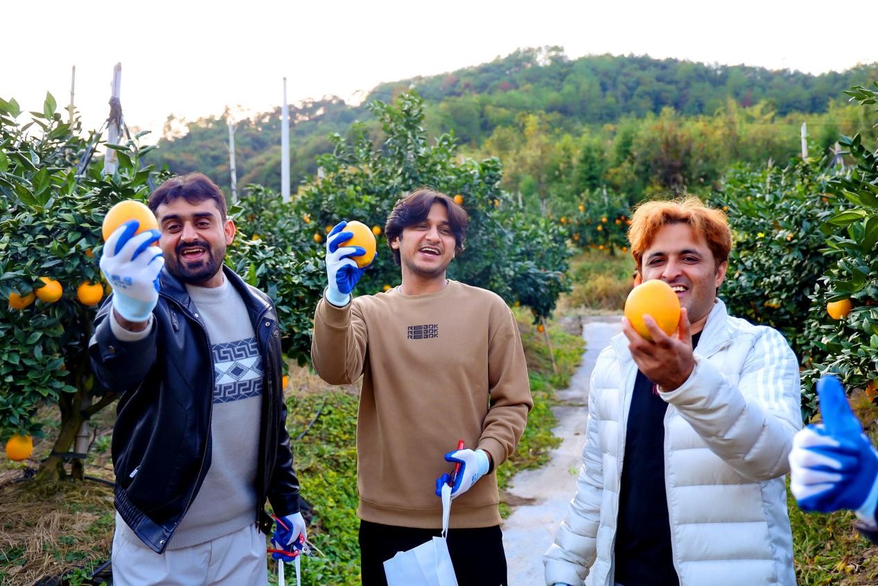 Foreigners pick navel oranges in an orchard in Anyuan county, Ganzhou, east China's Jiangxi province. (Photo/Zhu Haipeng)