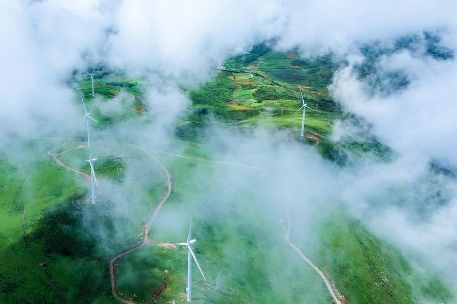 An aerial drone photo taken on Aug. 19, 2025 shows a wind power project in Qiubei County, southwest China's Yunnan Province. (Xinhua/Peng Yikai)