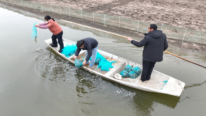 Farmers release crab seedlings in a pond in Gaochun district, Nanjing, east China's Jiangsu Province. (Photo courtesy of the media convergence center of Gaochun district)