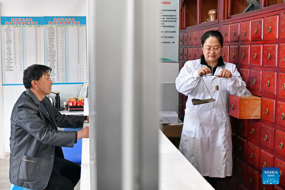 A doctor weighs ingredients to produce traditional Chinese medicine (TCM) for a villager in the clinic in Wujia Village of Zangjiazhuang Town, Yantai City, east China's Shandong Province, March 15, 2026. Shandong Province has been striving to strengthen the foundation of medical and health service system, and enhance grassroots medical service capacity. (Photo by Sun Wentan/Xinhua)