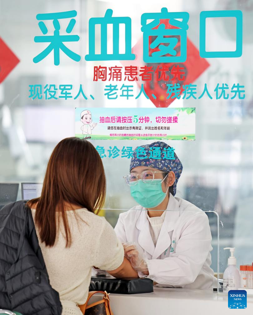 A medical worker takes a patient's blood at a health center in Tancheng County of Linyi City, east China's Shandong Province, March 14, 2026. Shandong Province has been striving to strengthen the foundation of medical and health service system, and enhance grassroots medical service capacity. (Photo by Zhang Chunlei/Xinhua)